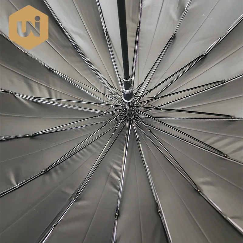16k UV Stockschirm für Erwachsene Rahmen und Schaft aus Glasfaser, Griff aus Gummi, Stoff mit schwarzem Pongee-Beschichtungsdruck, fester Stoff mit wasserabweisender Wirkung. |