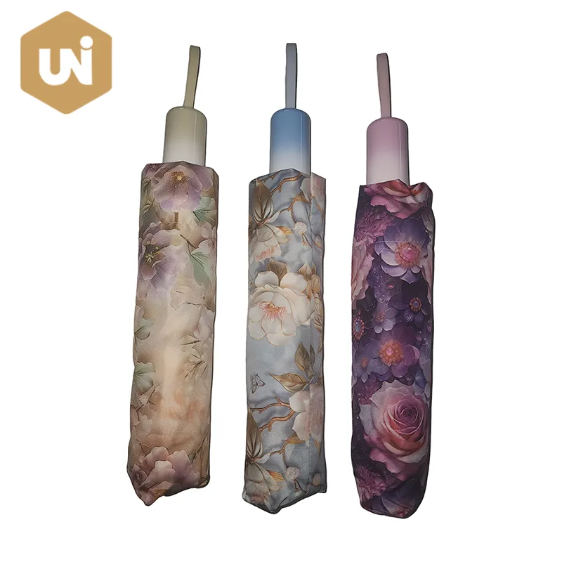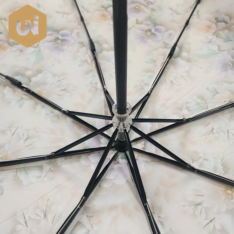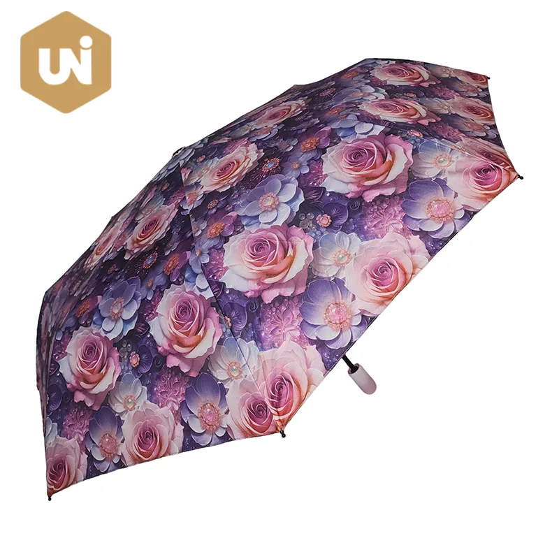 Der faltbare, manuell zu öffnende Regenschirm mit Blumenmuster ist Ihr zuverlässigster Schutz. Der Automatikknopf ermöglicht ein bequemes und reibungsloses Öffnen.
